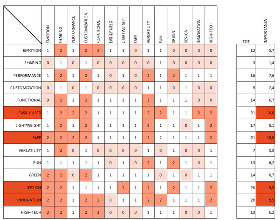 The independence matrix (Figure 6) puts requirements found in the previous analysis into a scale of importance. The most important elements for the designer in the preliminary stages of design are summarized in the characteristics stated in the rows and columns of the chart. Then an interpolation of these features is performed based on the factual needs regarding the internal system and the final user, the values in the chart are identified through a scoring system agreed upon upstream of the analysis.