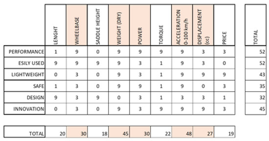 The six questions of the QFD were applied to the case study in the first design phase of our innovative naked motorcycle. The customer’s answers, which allow the requirements from analyses with the interrelation matrix to be found, are crucial in the next analyses. From the preceding analysis and the research carried out, key words are extrapolated for the product to be designed, which serve as a guideline in the subsequent matrix analysis and design phases.