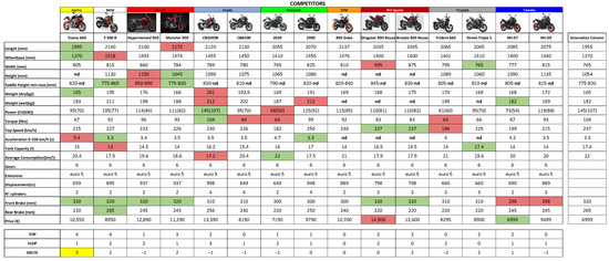 To design an innovative naked motorbike, it is fundamental to analyze the models already existing on the market. Benchmarking is the process to study and systematically compare the various products and avoid subsequent change requests due to reprocessing or mistaken decisions made during the design process [26].