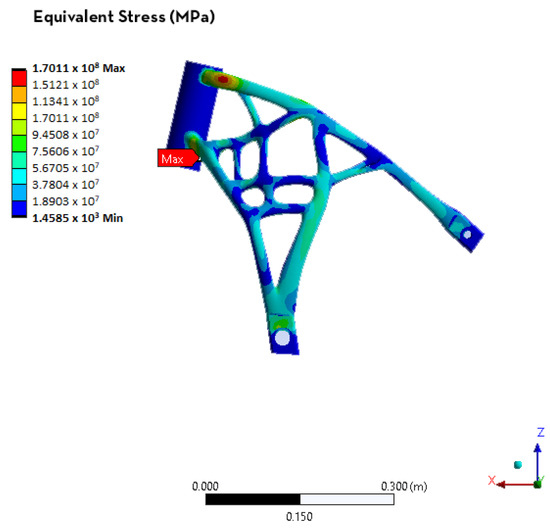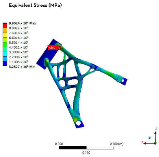 Afterwards, the entire model was imported into the ANSYS software to validate the geometry obtained. This software is versatile for the number of calculations that can be used for assessments so that engineers can reach the target values [44]. The geometry was slightly modified by eliminating fittings and chamfers that were not necessary for the FEM analysis and, in order to reduce the number of elements, only half the frame was simulated by imposing a symmetry constraint on the software. The mesh used was 3 mm with tetrahedra 3D elements. The two static linear analyses of the two load cases were carried out: static and limit braking overturning. The weight of the engine was 700 N and the weight of the rider was 900 N, so a limit breaking scenario in X and Z axes was applied with 2913 N and 2700 N, respectively. In the static case, the performance was considered sufficient with a maximum deformation of 0.14 mm and an equivalent stress of 10 MPa (Figure 22).