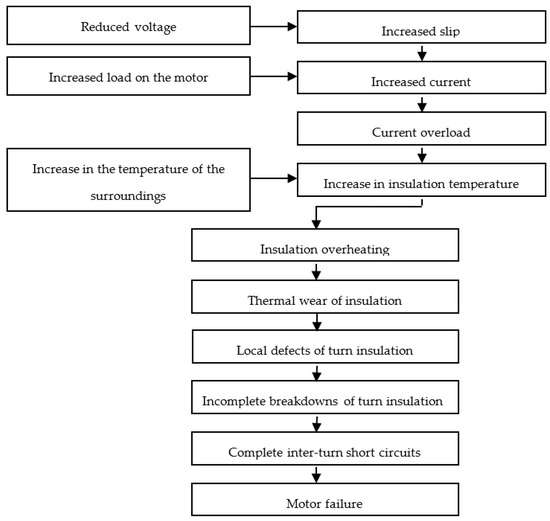 Such a wide distribution of induction motors can be explained by their high reliability and relatively low manufacturing cost [6,7]. At the same time, the operational reliability of induction motors in all sectors of the European economy is insufficient, as evidenced by the following: the annual cost of repairs and maintenance of these motors amounts to 8% of the annual cash flow of any branch of economic activity [8]. Up to 4% of induction motors fail annually [9]. The primary reason for such low operational reliability of these motors is external exposure to various factors on the part of the mains power supply and the peculiarities of working machines. This becomes especially relevant with the increasing use of alternative energy sources for power supply from local networks (such factors include changes in wind speed, solar insolation, etc.) [10,11,12]. The thermal ageing of insulation and reduced supply voltage at the terminals of induction motors have a significant impact on their operational reliability [13,14,15,16,17,18,19].