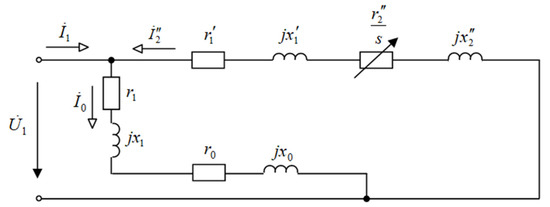 The diagram (Figure 3) shows the following: —complex of effective phase voltage; —complex of effective phase current; —complex of effective current in the load branch; —complex of effective current in the magnetizing branch; s—slip of the motor; , , , , , , —circuit parameters.