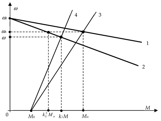 In Equation (17), the slip is the indicator of the operation mode of the motor, in addition to the multiplicity of the voltage, which also depends on the voltage. It is known that the slip of the induction motor at constant load depends on the square of the voltage [45,46], but it is not clear how the simultaneous change of voltage and load on the motor shaft affects the slip. Moreover, it is unclear whether it is necessary to take into account the mechanical characteristics of the working machine driven by the electric motor. Therefore, let us analyze the effect of reducing the voltage on the slip of the motor taking into account its load coefficient and the mechanical characteristics of the working machine that it drives. For this purpose, let us use the mechanical characteristics of the three-phase induction motor and the working machine (Figure 4).
