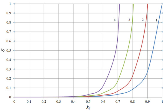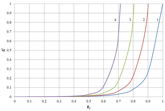 Dependence ε = f (kl) at x = 1, ku = 0.9.