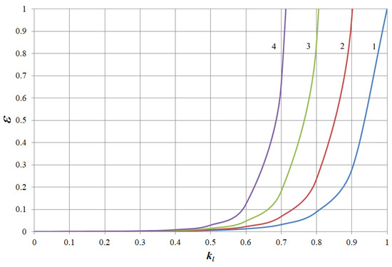 As can be seen from Figure 5, Figure 6, Figure 7 and Figure 8, the dependences are of the same type, which is determined by the exponential dependence of the rate of thermal wear of insulation shown in (1). However, the numerical values of the rate of thermal wear of insulation with the same electric motor driving working machines with different mechanical characteristics differ when the voltage is reduced. This can be seen from the results shown in Table 1, Table 2, Table 3 and Table 4. The tables show examples of the dependence ε = f (kl) at ku = 0.9 for AIR132S4 induction motor driving working machines with different types of mechanical characteristics.
