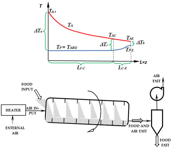 In this work, in an attempt to overcome this limitation, ordinary differential equations (ODEs) describing the drying process inside the drum—where the air continuously cools and humidifies while the product dries—are set. The solution of these ODEs will provide equations that will constitute a more complete mathematical model than that used by Perry et al. (2019) [13].