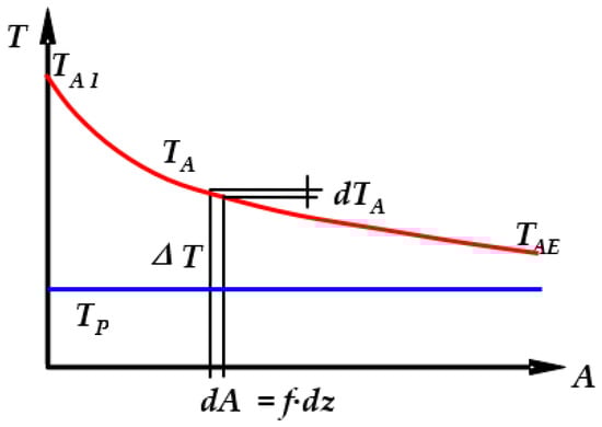 Diagram of the temperature of the air TA (red line) and product TP (blue line) vs. the exchange surface A. The elemental area dA is equal to the product of elemental length dz and the quantity f (see Figure 3).