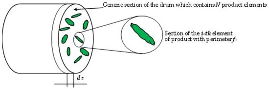 Generic section of the drum containing N product elements. In the foreground, the i-th element with perimeter fi is shown. The average value of the sum of the perimeters fi of all elements in the generic drum section constitutes the “transverse dimension,” which is multiplied by the infinitesimal axial length dz to give the elemental area dA = f·dz.