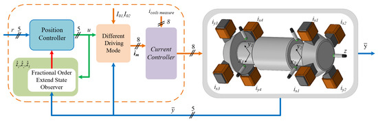 The control strategy of the CAMB in a canned motor pump, presented in Figure 6. Position sensors measure the difference between the desired and actual rotor positions and transmit these data to the FOESO and the structure “different driving mode”. The control signal is then calculated using the FOESO and position controller. The control signal and available information are used by the current controller to change the attraction force for the electromagnets in order to change the position of the rotor. In order to evaluate the performance of the proposed control system compared with conventional ADRC and PID for CAMB, three scenarios are expressed as follows: