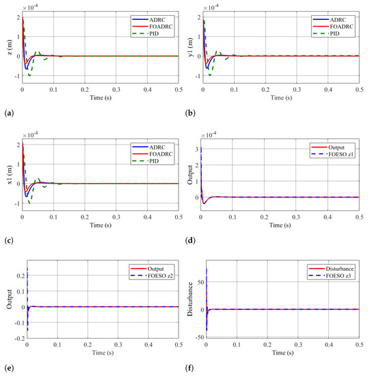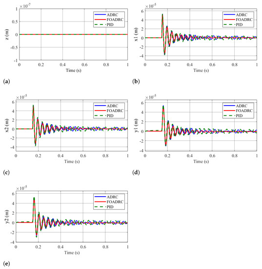 The performance of the FOADRC controller is verified and compared with PID and ADRC controllers. The FOADRC system’s position response achieves no fluctuation, a shorter settling time, and a small overshoot peak, as shown in Figure 7a–c. As a result, the FOADRC controller shows superior controllability compared to the ADRC and PID controllers when the rotor is not spinning around the z-axis and is deviated from the equilibrium position.