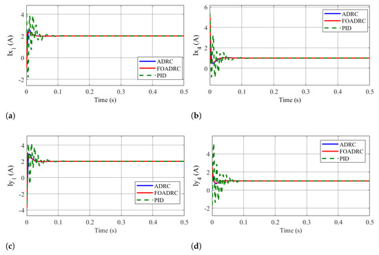 The required levitation control currents in upper and lower coils computed by the FOADRC, ADRC, and PID controllers are shown in Figure 8. Unlike the PID controller’s current, the FOADRC controller’s current rapidly brings the rotor to equilibrium, with only bias current flowing through each coil.