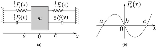 The system shown in Figure 1a is a simple mechanical oscillator with damping . A special shape of the elastic force is shown in Figure 1b. When there are no external forces, it drives the mass m into two possible stable states: or , so the system is bistable. The point b is an unstable equilibrium, from which the mass escapes under infinitesimal perturbations. When such a bistable system is excited by harmonic oscillations, with the growth of oscillation amplitude or frequency, it experiences a set of period-doubling bifurcations and eventually falls into a chaotic regime.