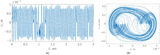 The value of v was reconstructed from x computationally by numerical differentiation. Figure 12 demonstrates time domain and phase portrait obtained at the following values of parameters: initial distance mm, excitation frequency Hz.