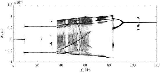 Let us investigate the model by changing the frequency of vibration f and the initial distance between side magnets D. Bifurcation diagrams while varying parameters f and D are shown in Figure 6 and Figure 7, respectively. Note that chaotic motion presents only in a certain frequency band. This phenomenon is common for physical implementations of the Duffing oscillator, e.g., compare the obtained results with the results obtained for the electrical model in [12].