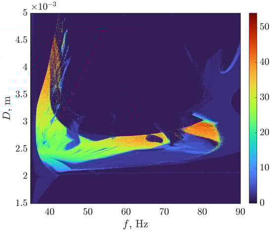 We also provide a two-dimensional bifurcation diagram about parameters f and D, see Figure 8. The pseudoimage of a two-dimensional bifurcation diagram is obtained using the kernel density estimation (KDE) algorithm [34] applied to each point of the diagram.