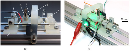 The experimental setup was created using 3D photopolymer printing and parts of the industrial CNC machines. The design contains only four specific 3D-printed details: two side frames, a carriage, and a top frame. Magnets, screws, a DC vibration motor, and an aluminum profile were on-the-shelf products. Linear guides are identical to those used in DVD drives. Figure 9 presents the physical prototype. The numbers in the annotation correspond to the numbers in Figure 3a. One can see the features of the implemented design in detail: the repulsive magnets, vibration motor (DC motor with an unbalanced rotor), displacement measurement optical system and other features.