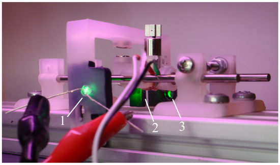 Optical displacement measurement system. (1) Green LED; (2) 3D-printed photopolymer shutter painted in black; (3) photodiode..