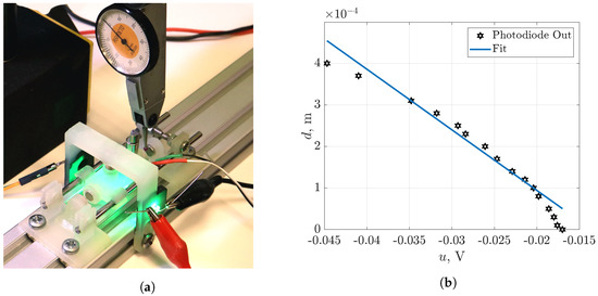To convert the photodiode voltage to a displacement, we performed a set of measurements using the digital oscilloscope with a software DC meter, and the dial test indicator (Figure 11a). Obtained voltage–distance pairs were approximated by a linear function, see Figure 11b, with resulting RMS error m.