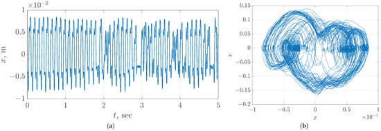 In all numerical simulations, we use the 8th-order Dormand–Prince integration method with integration step size . The initial conditions of all variables were zeroes. The time series and phase portrait of the proposed mechanical chaotic oscillator obtained by numerical simulation are shown in Figure 5.