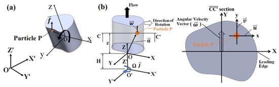 In Equation (1), and are the velocity and acceleration of particle P with a mass m relative to the moving frame of reference oxyz. The direction of Coriolis acceleration (force), () perpendicular to and is in-phase (opposed) or opposed (in-phase) to the tangential velocity of rotation for a radially outward or inward flow. The centripetal acceleration (centrifugal force) specified as () always acts radially inward (outward) regardless the flow direction in the duct. As specified by Figure 1b where the duct rotates around the y axis with an angular velocity, Ω, and has an origin OXYZ located at a distance, H, from the inertial frame O′X′Y′Z′, the position () and angular velocity () vectors described by the moving coordinates OXYZ are defined as Equations (2) and (3) with in Equation (1) as Equation (4) where the coordinates of particles are specified as (x, y, z) with their unit vectors of , , and .