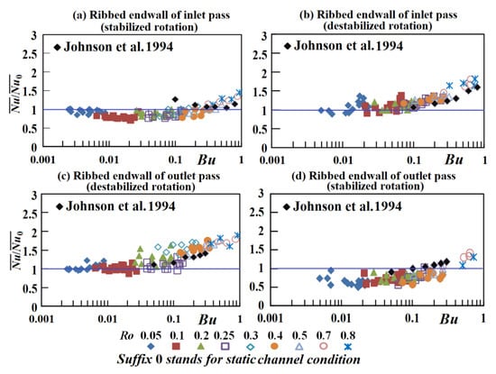 The rotation number is proportional to fluid pressure, P, angular velocity of rotation, Ω, and the square of dh; however, it is inversely proportional to fluid bulk temperature, Tb, and Reynolds number, Re. Johnson et al. [3,4,5] fulfilled the NASA HOST program by increasing P to significantly extend Ro up to 0.4–0.5 by running the test rig at a speed of approximately 1000 rev/min. To control Ro at a realistic engine condition of approximately 0.5, Chang et al. [6] increased dh to approximately three times that adopted by Johnson et al. [3,4,5] for further reducing the rotating speed to implement the infrared radiography method for measuring the full Nu map on a rotating surface. In Equation (16), while Ro is proportional to P as attempted by Johnson et al. [3,4,5], the most effective way to extend the Ro range is to increase dh, as Ro is proportional to dh2. Using a square two-pass channel with 45° ribs on the two opposite leading and trailing endwalls of the inlet and outlet passes as a standard channel geometry [6], the favorable agreements between the data generated by increasing P [5] and dh [6] are reached as shown as Figure 2. The various attempts to raise Ro by either increasing P [5] or dh [6] engendered similar heat transfer results, affirming the similarity law defined in Equation (14). A noteworthy feature in Figure 2a,d is the reversed Ro-driven heat transfer impediment to enhancement from the static-channel reference () once Ro exceeds a critical value. Having extended the Ro range, an attendant Bu extension is acquired as Bu is proportional to Ro2 in Equation (17). An implication of the favorable agreements between the heat transfer data generated at the various Re ranging from 5000–24,000 [5,6] in Figure 2 permits the normalized ratio to be a function of Ro and Bu for a set of thermal, flow, and geometric boundary conditions as illustrated in detail in [2,7].