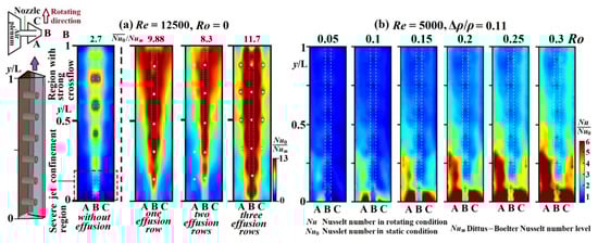As a set of illustrative examples for leading-edge cooling, Figure 4 depicts the Nusselt number maps of a trapezoidal channel cooled by an impinging jet row (a) without and with one, two, and three effusion rows in static conditions [11] and (b) with rotation for the non-effusion channel [12]. Over the hub region of the non-effusion channel in Figure 4a at zero Ro (static condition), the characteristic Nu0 map with a high heat transfer zone around an impingement spot (stagnation point) of an impinging jet scheme is diminishing due to the significant jet flow confinement at the channel hub. At the channel tip, the considerable diffusion of the jet momentum by the strong crossflow obscures the Nu0 peak at the impingement spot for the non-effusion channel. When the spent fluids are vented from the effusion holes to moderate the confinement and crossflow at the hub and tip regions, respectively, the cooling effectiveness of the impinging jet row is recovered. This is clearly visible in Figure 4a, where the high Nu0 stripes are extended and intensified along with the advection of the spent flow in each effusion channel. Although the local cooling performance adjacent to the channel hub is noticeably improved from that without effusion compared with 4a, the unfavorable confinement effect remains persistent over the hub region. When the centrifugal force is induced by rotation, the heat transfer recovery over the hub region of the non-effusion channel is systematically amplified as Ro increases from 0.05 to 0.3 in Figure 4b. The prevailing centrifugal force in the radially outward direction assists to improve the fluency of the spent fluid flow over the hub region.