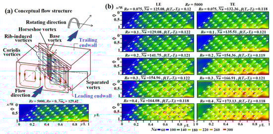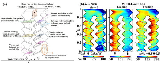 (a) conceptual flow structure (b) Nusselt number maps at Ro = 0 and 0.4 of two-pass furrowed channel with angled ribs. (Reprinted/adapted with permission from Ref. [14]. 2021, copyright Elsevier.)