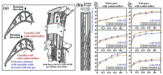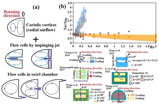 (a) conceptual flow structures on the cross-section of a leading-edge rotating coolant channel (b) variations of Nu/Nu0 against Ro for the rotating channels typical in the leading edge of a gas turbine rotor blade using impinging jets and swirl chambers [12,30,32,33,34,37].