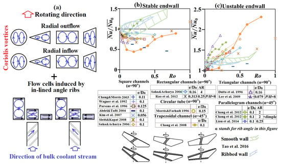 (a) conceptual flow structures on the cross-section of a rotating ribbed coolant channel; variations of endwall-averaged Nu/Nu0 ratio against Ro on (b) stable (c) unstable walls of the rotating ribbed channels with square, circular, trapezoidal, triangular, and parallelogram shapes [2,4,20,61,62,63,72,73,74,75,76,77,78,79,80].