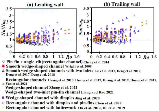 The cooling performances in the rotating channels applicable to the mid-chord cooling of a gas turbine rotor blade varied with channel shape (orientation) and the HTE elements (methods). In the literature, the full Nu maps over the rotating surfaces involving Bu effects are relatively rare in comparison with the heat transfer data detected from thermocouple measurements. As it is more critical to identify the minimum Nu on a rotating surface for preventing material burnout, the correlative analyses between the regionally minimum and averaged Nu for a variety of rotating channels should take priority in order to characterize the safety margin when an internal cooling design of a gas turbine rotor blade is relied on for the heat transfer data to be converted from thermocouple measurements. In the previously reviewed works for mid-chord cooling, the available Nu/Nu0 data against Ro are summarized in what follows to comparatively reveal the differential Ro effects caused by channel shape, HTE elements between ribs and dimples, and the various types of HTE attempts.