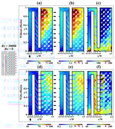 - Deng, H.; Wang, Z.; Wang, J.; Li, H. Flow and heat transfer in a rotating channel with impingement cooling and film extraction. Int. J. Heat Mass Transf. 2021, 180, 121751. [Google Scholar] [CrossRef]