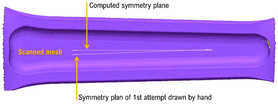 Proceeding iteratively, it is possible to arrive at the plane that minimizes that function. In this function, the distances are considered as positive, unsigned numbers. It follows that the resulting plane does not necessarily pass through all the selected points (potentially none) but is equally the one that best approximates the plane surface under consideration. The same reasoning applies when the research of a plane of symmetry is conducted. In that case, it is important that the points of the selected scan belong to an effectively symmetrical mesh. On the scanned mesh, the lack of numerous points in the areas of the connecting rod end and head was evident. This is because the laser cannot cover a hole through its entire depth, especially if its diameter is relatively small. Because of this, it was preferred to isolate the connecting rod shaft (found to be complete) to derive the two main planes of symmetry of the part. Isolating only one part of the component in a sub-mesh (as long as it is always symmetrical) is a good strategy to minimize the computational error on the plane of symmetry. In fact, it is easy to see that if absurdly the points of all one half of the part were missing, it would be impossible to possess the mathematical data regarding their positioning in space and thus derive a plane of symmetry by involving them in the calculation.