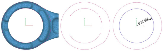 Another common difficulty due to the Design X software computation is related to the fact that the geometric dimensions detected on the scan are provided with abundant significant figures, so it is ambiguous to define the new design dimension associated with a particular feature (for example, the diameter of the hole in the connecting rod head). This error on the order of one tenth of a millimeter can be due to a laser defect, or an alignment between two scan parts performed too roughly. However, with exact reconstruction of the part being the goal, it is necessary to verify the dimensions at the design stage. An example of reverse sizing is presented in Figure 5.