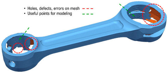 As mentioned earlier, the use of a blue light laser scanner is the best solution to minimize the overall final error on model reconstruction from the early stages of reverse engineering [21]. Using a scanner is useful to quickly derive the shape of the outer surfaces of an object. A series of points are thus derived as output and can be used to create a mesh that can represent the part [22]. The laser used for scanning the connecting rod is the FARO Quantum S, which is equipped with a blue light and a probe (the latter is equipped with a spherical probe useful for detecting by direct contact the points on the surface of the component). The manufacturer’s stated level of resolution is half a tenth of a millimeter, so it is perfectly consistent with this type of application. Resolution is an indicative level of the accuracy of such technology. If five-hundredths of a millimeter is guaranteed by the manufacturer, it means that any point scanned is no farther than 0.05 mm from the ideal surface obtained from the scan [23]. An ideal surface is defined as one obtained from a scan completely free of defects. The connecting rod was initially cleaned to remove residual dust or grease from its surfaces. This step is particularly important because the presence of such elements causes them to appear in the STL mesh of the scan, as if they were an integral part of the connecting rod. Next, it was scanned from both sides, and then the scans of the two halves were aligned and joined using Geomagic Design X 2022 software (designed specifically for reverse engineering). The use of software programmed specifically for reverse engineering ensures a reconstruction of the model surfaces through a process of mathematical interpolation or extrapolation. Thus, CAD software designed for traditional design (forward engineering) is not the optimal solution for this type of problem. The entire procedure is found to be heavily affected by error in all its stages, starting with scanning.