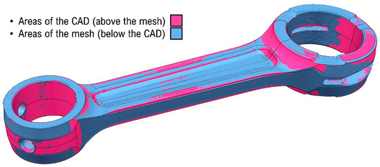 From the overlay between the CAD model and the starting mesh, it is possible to obtain an idea of the effectiveness of the reconstruction. There are some areas where the mesh is above the surface of the model. In this case, the comparison between the two models has a negative deviation value. On the contrary, in the areas where there is an excess of material, there is a positive deviation. This finding is shown in Figure 7.