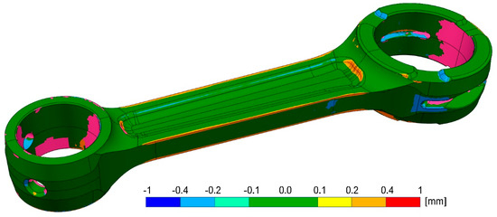 After performing each feature to obtain the final shape of the component, it is compared with the mesh obtained from the scan (Figure 6). This step is useful to highlight the areas that are most distant from the original. In some cases, even a deviation of 1 mm, for example, is acceptable in the case where a series of changes on the geometry follow to design a different component from the starting one. In case, on the other hand, the mechanical behavior of the connecting rod is to be simulated, such a gap is not acceptable to obtain likely correct data at the end of the structural analysis performed on the geometry.