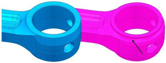 Material was also removed on the connecting rod head to promote lubrication of the needle bearing. This was intended to make an opening with no sharp edges in the final model, which would otherwise locally increase the tensional state within the material. Finally, material was also removed from the edge of the connecting rod head in the same way as was performed on the end, as shown in Figure 10.