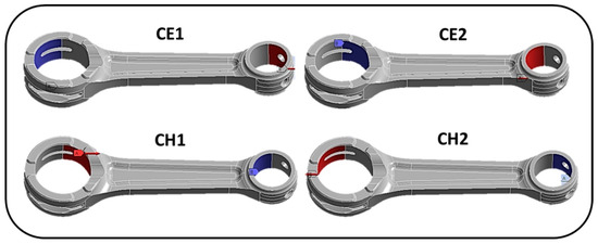 CE1 and CE2 represent load cases 1 and 2 on connecting rod end. Blue is a hinge. Red is the force, applied as uniformly distributed on the area with the direction according parallel to connecting rod axis, the value and sign according to the calculation and reference system. CH1 and CH2 are the load cases to study the connecting rod head.