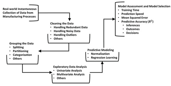 Presently, contemporary manufacturing technologies now support the embedding of predictive modeling and other AI-based paradigms into many manufacturing and production processes [18,19,20]. Some of these manufacturing processes include, but are not limited to, maintenance planning, quality control, monitoring and regulation, and robust automation of shop floor operations [18,19,20]. Hence, there is a growing need to have a generic framework that supports the holistic and granular use of data sets from manufacturing processes to support data-driven innovations and inventions in manufacturing environments. To respond to this need, a generalized framework is presented and investigated in this paper to support predictive modeling in manufacturing environments. More specifically, the following contributions are made: