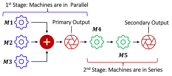 A case study involving a multi-stage continuous-flow manufacturing process is used to validate the proposed framework in Section 2.2 and the architecture of the manufacturing process is shown in Figure 2. In contrast to batch production or manufacturing process, the materials being processed in this case study are constantly in motion on the shop floor along the production or manufacturing process line. The main elements of the multi-stage continuous flow manufacturing process are five operational machines (, , , , and ) and a combiner () that are employed in two stages (see Figure 2). Sensors have been used for data (temperature, pressure, speed, and others) collection [23]. Some of the data collected include (but are not limited to) factory ambient conditions, temperature, pressure, speed, and amperage of the machines. Since the goal of our work is to primarily report on predictive modeling, the manufacturing process and the manufacturing environment used as the case study have not been extensively discussed. However, more details about the manufacturing process and manufacturing environment can be found in [23] or by contacting [24].