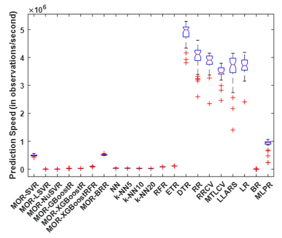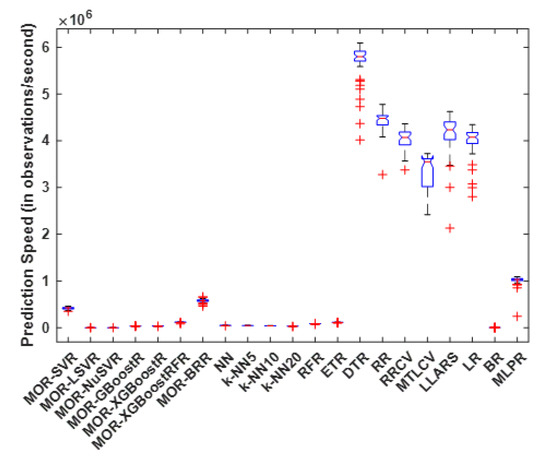 Generally, in machine learning, the prediction speed () of a method is derived as the total number of predictions made by a method divided by the time taken to make the predictions. It is measured in observations per second (obs/s). The of all methods for the first stage of the predictive modeling of the multi-stage continuous-flow manufacturing process is reported in Table 6. From Table 6, the following observations are made for : (1) The of all methods are generally higher than 90 obs/s on average. (2) DTR shows the best average and median of obs/s and obs/s, respectively, over the 50 independent runs. (3) The average and median for RR and RRCV ( obs/s and obs/s, and obs/s and obs/s, respectively) over the 50 independent runs are also fast. (4) MOR-NuSVR shows the worst average and median of obs/s and obs/s, respectively, over all 50 independent runs. (5) The average and median for MOR-LSVR and BR ( obs/s and obs/s, and obs/s and obs/s, respectively) over the 50 independent runs are also slow. (6) The robustness of all the methods is relative according to their standard deviations over all runs: MOR-NuSVR has the lowest standard deviation of 2.1876 and RR has the highest standard deviation of . So, in terms of stability for the first stage of the predictive modeling of the multi-stage continuous-flow manufacturing process, MOR-NuSVR can be said to be the most robust among all the methods, while RR is the least robust. The box plots of for all the methods are shown in Figure 5, for the first stage of the predictive modeling of the multi-stage continuous-flow manufacturing process. The findings earlier discussed can be corroborated visually by an examination of the variations in for all the methods in Figure 5.
