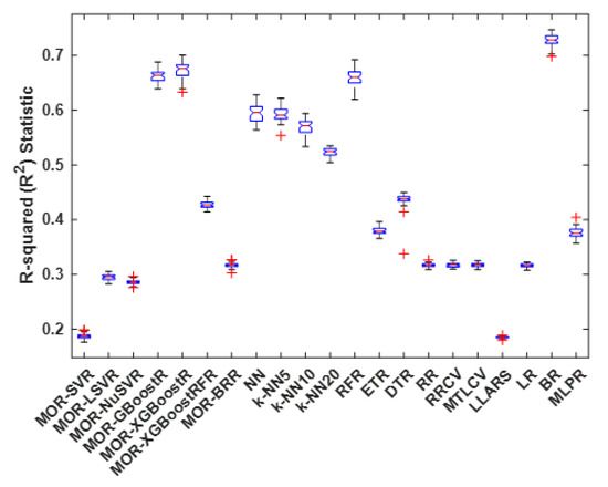 In a similar vein to the discussion above for Table 10 and Figure 9, the following observations are made from Table 11 for the of all methods for the second stage of the predictive modeling of the multi-stage continuous-flow manufacturing process: (1) The of all methods are generally higher than 3.0 on average. (2) RFR shows the best average and median of 3.5 and 3.5, respectively, over the 50 independent runs. (3) The average and median for MOR-GBoostR and MOR-XGBoostR (3.6 and 3.7, and 3.7 and 3.7, respectively) over the 50 independent runs are also relatively low and comparable. (4) MOR-SVR shows the worst average and median of 10.9 and 10.9, respectively, over the 50 independent runs. (5) The average and median for MOR-LSVR and MOR-NuSVR (10.2 and 10.2, and 10.3 and 10.3, respectively) over the 50 independent runs are also high and comparable. (6) The robustness of all methods is relatively according to their standard deviations over all runs: MOR-GBoostR, MOR-XGBoostR, MOR-XGBoostRFR, NN, k-NN5, k-NN10, k-NN20, RFR and BR have the least standard deviation of 0.1, while MOR-SVR, MOR-LSVR, and MOR-NuSVR have the highest standard deviation of 0.3. So, in terms of stability for the second stage of the predictive modeling of the multi-stage continuous-flow manufacturing process, MOR-GBoostR, MOR-XGBoostR, MOR-XGBoostRFR, NN, k-NN5, k-NN10, k-NN20, RFR and BR can be said to be the most robust among all the methods, while MOR-SVR, MOR-LSVR, and MOR-NuSVR are the least robust. The box plots of for all the methods are shown in Figure 10, for the second stage of the predictive modeling of the multi-stage continuous-flow manufacturing process. The findings earlier discussed can be corroborated visually by an examination of the variations in for all the methods in Figure 10.
