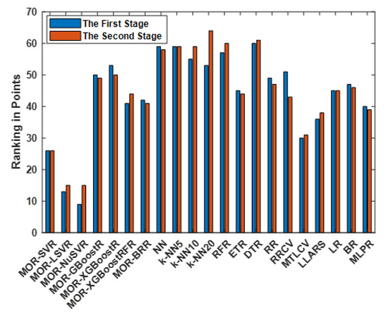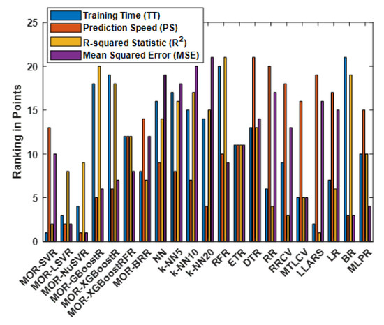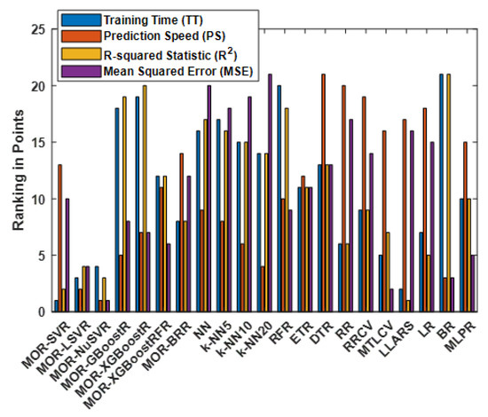 To straightforwardly rank all methods based on inference, positions or points are assigned to each method using their average performances (over the 50 independent statistical runs) for training time (), prediction speed (), R-squared values () and mean squared error (). The points are assigned in descending order of performance to have: 21, 20, 19, 18,…, 1. In this way, the best method(s) will have 21 points and the worst method(s) will have one point. Table 12 and Table 13 show how the overall points (sum of all points or the positions) obtained by each method can be used to deduce the overall ranking for the first and second stages of the predictive modeling of the multi-stage continuous-flow manufacturing process, respectively. These results are further corroborated in Figure 11, Figure 12 and Figure 13 where the ranking (in points) of all methods using the average values of their performance metrics (i.e., , , , and ) over 50 statistical runs are shown for the first and second stages of the predictive modeling of the multi-stage continuous-flow manufacturing process.