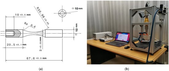 VHCF tests require an accurate specimen design, especially for materials with a non-homogenous structure at the macroscopic level. SLM produces a layer-by-layer structure due to technological features. The thickness of an individual layer depends on the laser spot parameters and scanning strategy. The next difficulty is correct material filling during the specimen’s production. The presence of voids may affect the mass density of the material. These parameters have an important impact on the dynamic response of the resonant system. That is why, prior to the specimen’s design, a straight cylinder was produced to study the natural frequency of the material. This cylinder was used to determine the mass density of the material and the dynamic Young’s module. The cylindrical bar was investigated on a VHCF testing machine to obtain the exact value of the natural frequency. Based on these premature investigations, the following parameters for the SLM material were obtained: (1) mass density = 2700 kg/m3 and (2) dynamic Young’s modules = 72 GPa. The final shape of the SLM specimens for the VHCF tests made from AlSi10Mg is presented in Figure 1a. A view of the VHCF testing system for axial loading is presented in Figure 1b.