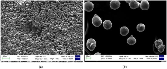 The quality of the final SLM product is depending on the quality of initial powder, laser scanning parameters and strategy []. The particles of AlSi10Mg aluminum alloy were primary investigated on SEM (Figure 3).