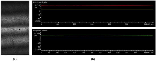 The roughness investigations on the produced specimens in different directions (along the specimen axis and across) have shown the following range of Ra = 0.25–0.43. Some scratches and dimples can be observed on the lateral surface of the specimen (Figure 4a). The scratches are due to mechanical polishing.