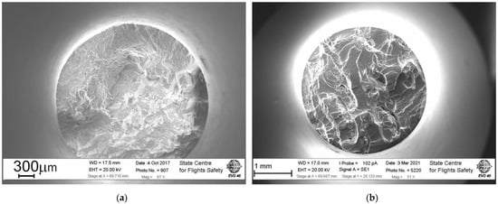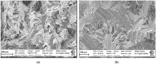 The fracture surface does not show any significant changes in crack growth mechanisms that do not allow introducing three stage schemes like it was for hot-rolled specimens. The fracture surface does not show numerous quasi-brittle fracture patterns like it was for hot-rolled specimens. Also, the final fracture fraction is very small compared to the traditional technology specimens. The low roughness of the fracture surfaces and low deviation of crack path from the plane of normal stress indicated a quite high crack growth rate for SLM material under VHCF loading. The large regions of the material were failed in the one single plane (Figure 12 and Figure 13).