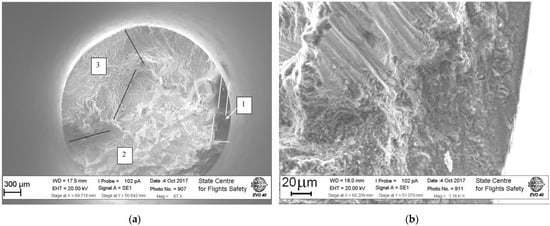 The analysis on the fracture surfaces of the hot-rolled specimens has shown two types of crack initiations: (1) surface and (2) subsurface crack nucleation. In the case of surface initiation, a semi-ellipsoid micro-crack was observed (Figure 9). The crack size by the specimen surface is about 40 micrometers and growth in depth for 15 micrometers. The plane of the initial crack is perpendicular to applied external load. The morphology of the crack initiation area shows amorphous pattern with bauble-like pattern. This area does not show a clear river like structures showing the crack growth direction. At a certain crack length, a sharp change in crack growth mechanism can be observed (Figure 9b). The fracture patterns turn to be usual for fatigue crack growth in crystallite materials. The initial stage of early crack growth in the plane of maximum normal stress is quite small. At about 80–100 micrometers distance, the radical change in crack growth plane can be observed (Figure 9a). The crack propagation plane has an angle with specimen axis about 45–60 degrees. The mix mode morphology of fracture surface can be observed: some areas show a quasi-brittle pattern while neighboring zones has a ductile fracture with clear dimples (Figure 9a). Further crack growth produces an inclined quasi-brittle fracture pattern that is quite different from initial state. Based on this principal difference two different stages can be introduced on the fracture surface (Figure 10).
