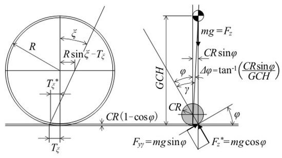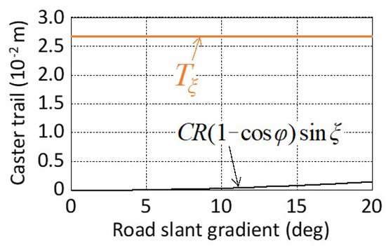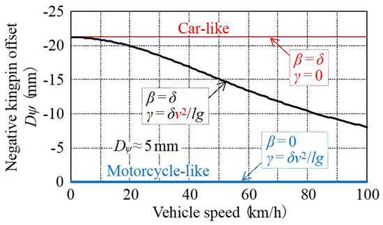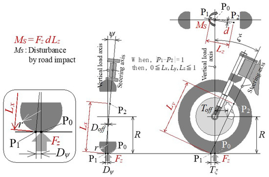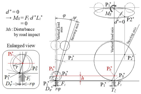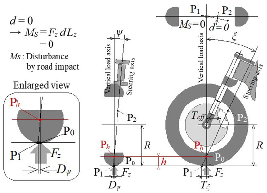 - Two unknown steering axis design parameters (caster angle (ξ), kingpin angle (ψ)) are derived from two vehicle requirements on steady characteristics, as minimization of steering disturbance due to reaction force against the vertical load when standing upright and maintaining zero steering disturbance even if the tire contact point moves laterally when the vehicle is tilted inward, as mentioned in Section 4.1. This derivation is a new knowledge from a completely unique point of view.