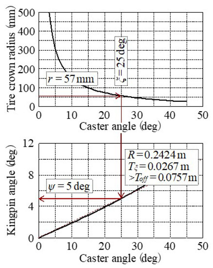 - Four unknown steering axis design parameters (caster angle (ξ), caster trail (Tξ), kingpin angle (ψ), kingpin offset (Dψ)) to derive in order to minimize the steering torque disturbances, are reduced into two unknowns (caster angle (ξ), kingpin angle (ψ)) by previous studies of requirements for caster trail (Tξ) considering tire lateral force and kingpin offset (Dψ), requirements considering the longitudinal braking force as mentioned in Section 3.2.2.